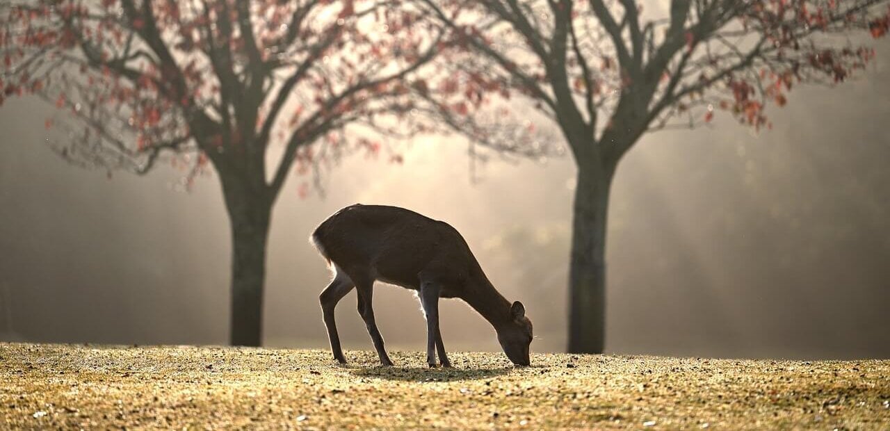 Deer in the forest with mist and sun in background
